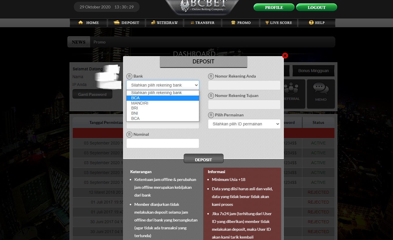 Untuk melakukan deposit, member diharuskan untuk login terlebih dahulu. Deposit hanya dapat dilakukan dari rekening bank yang sudah terdaftar sebelumnya. Pastikan Anda memeriksa rekening bank Anda sudah terdaftar (melalui proses pendaftaran ataupun melalui proses tambah bank) dan pastikan bank yang bersangkutan tidak dalam kondisi Offline. Jika Anda melakukan transfer pada saat bank sedang Offline, maka transaksi Anda akan kami proses setelah bank yang bersangkutan online kembali. 1. Di halaman depan OBCBET, Anda akan menemukan form login. Isi Username dan Password yang Anda gunakan pada saat pendaftaran. 2. Setelah anda berhasil login, Anda akan dibawa ke halaman Dashboard, kemudian klik tombol DEPOSIT yang terdapat di sebelah kiri. 3. Popup Form Deposit akan muncul, pilih bank, permainan, masukan nominal deposit yang anda transfer. Pastikan semua data sudah benar. 4. Jika semua data sudah benar, klik tombol DEPOSIT yang terdapat di form deposit.
