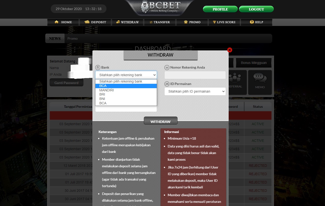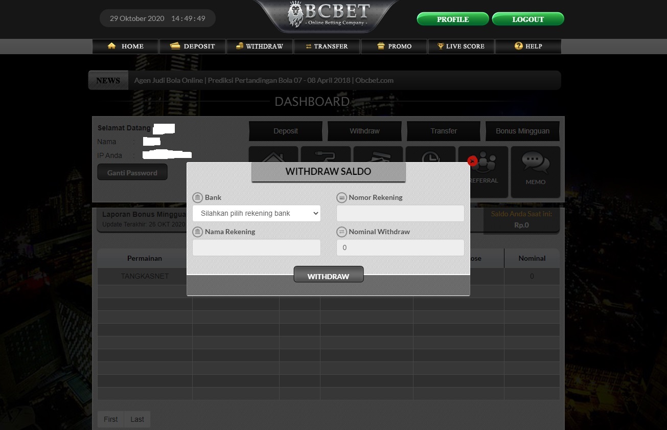 Untuk melakukan withdraw, member diharuskan untuk login terlebih dahulu. Withdraw / Penarikan dana hanya dapat dilakukan ke rekening bank yang sudah terdaftar sebelumnya. Pastikan Anda memeriksa rekening bank Anda sudah terdaftar (melalui proses pendaftaran ataupun melalui proses tambah bank) dan pastikan bank yang bersangkutan tidak dalam kondisi Offline. Jika anda melakukan transaksi Withdraw / Penarikan dana pada saat bank yang bersangkutan Offline, maka transaksi tersebut akan kami lakukan pada saat bank yang bersangkutan kembali Online . 1. Di halaman depan OBCBET, Anda akan menemukan form login. Isi Username dan Password yang anda gunakan pada saat pendaftaran . 2. Setelah terlogin, anda akan dibawa ke halaman Dashboard, kemudian klik tombol WITHDRAW yang terdapat di sebelah kiri. 3. Popup Form Withdraw akan muncul, pilih bank, permainan, masukan nominal withdraw yang ingin anda tarik. Pastikan semua data sudah benar. 4. Jika semua data sudah benar, klik tombol Withdraw yang terdapat di form withdraw.